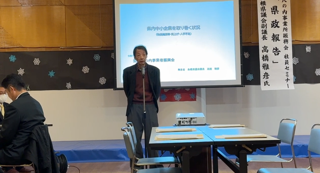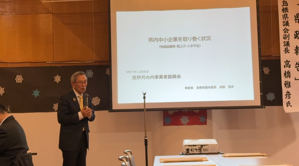 12月5日、斐伊尺の内事業所振興会主催で高橋まさひこ県議の県政報告会が開催されました。高橋県議の県政報告では、「県内中小企業を取り巻く状況」と題し、物価高騰等・賃上げ・人手不足による中小企業の実態をプロジェクターにより分かりやすく説明されました。
